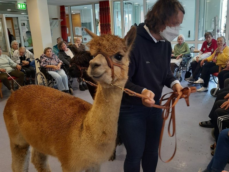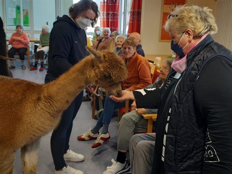 Unsere Bewohnerinnen und Bewohner konnten eine besondere Attraktion miterleben - den Besuch von zwei Alpakas, Anton und Geisa. Alle durften die Vierbeiner kennenlernen und waren von den flauschigen Tieren begeistert. Sogar eine Führung mit den Alpakas durch unsere Einrichtung fand noch statt.