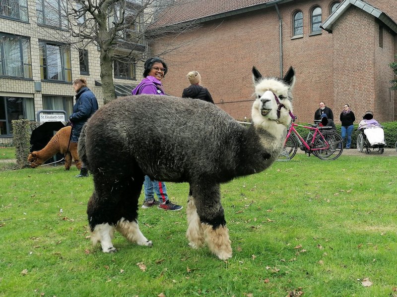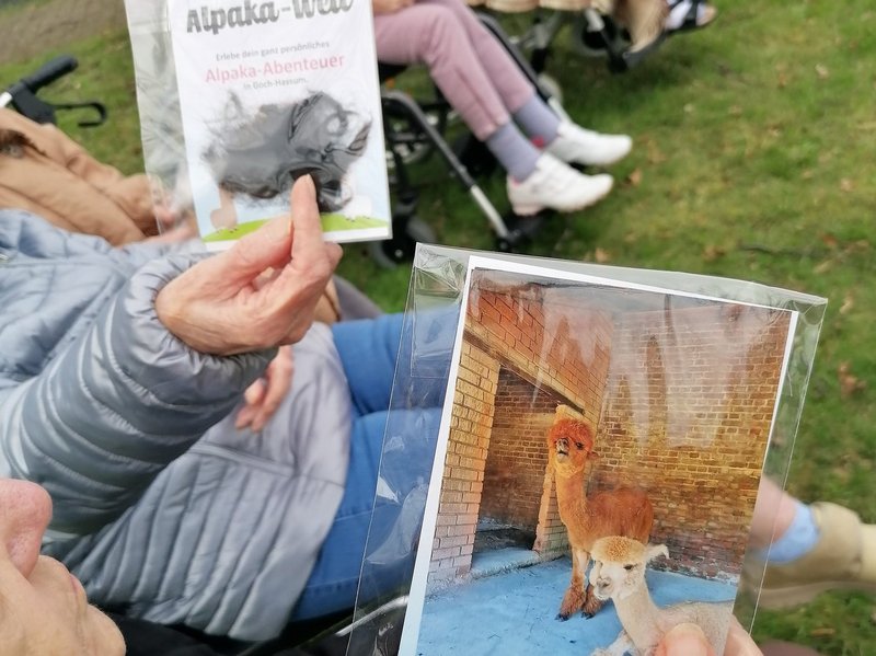 Nicole hat viele Informationen über die Haltungsbedingungen, Eigenschaften der Tiere sowie den Umgang mit den Tieren gegeben. Sie brachte Rohwolle und verarbeitete Wolle mit. Jede/r Bewohner/-in erhielt ein Alpakafoto und Wolle als Andenken.