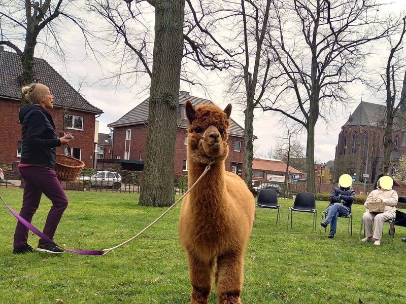 Die Alpakas „Gandalf“ und „Aladin“ waren mit ihrer Besitzerin Nicole Feldbusch aus Goch-Hassum von der Kunterbunten Alpaka-Welt am 29.03. bei uns auf der Wiese vor dem Haus zu Besuch.