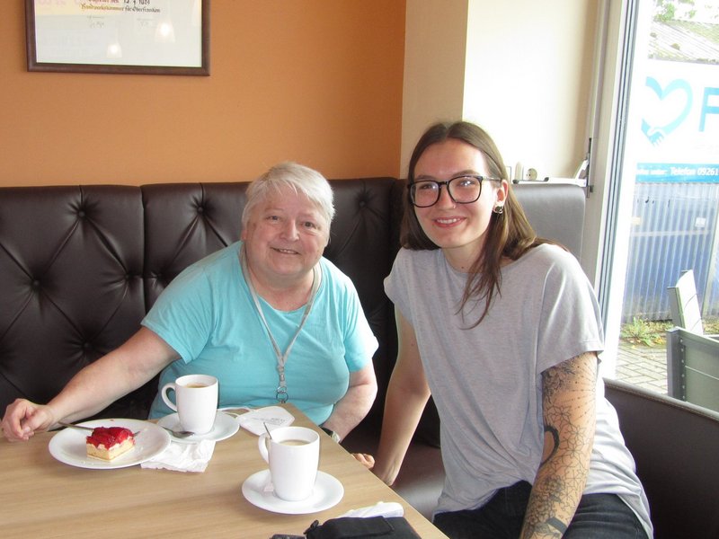 Auf Wunsch unserer Bewohnerinnen unternahm unsere Frauengruppe im Juli einen Ausflug ins Café. Zusammen mit unserer Sozialdienstpraktikantin Regina genossen alle die Gemeinschaft bei Kaffee und Kuchen in einer Bäckerei in Kronach. Das Bild zeigt eine Bewohnerin und rechts unsere Praktikantin.