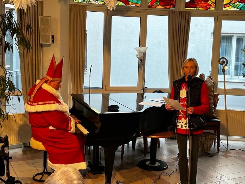 Frau Assenmacher vom Sozialen Dienst hat Gedichte vorgetragen und half dem Nikolaus beim Verteilen der Geschenke.