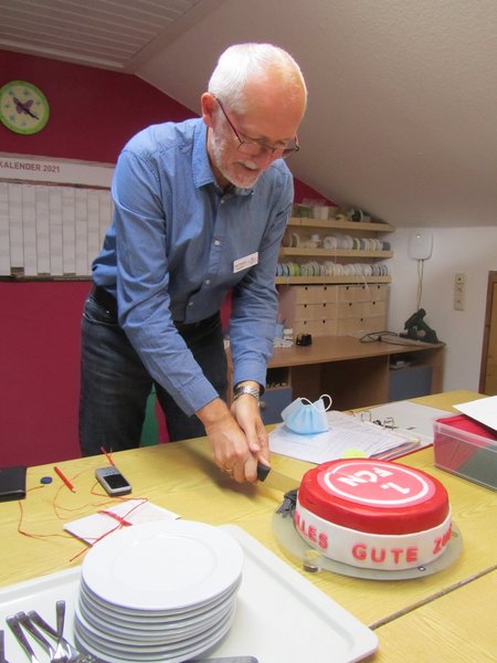 Mann mit grauem Haar schneidet eine Torte mit der Aufschrift "1.FCN - Alle gute zum... "