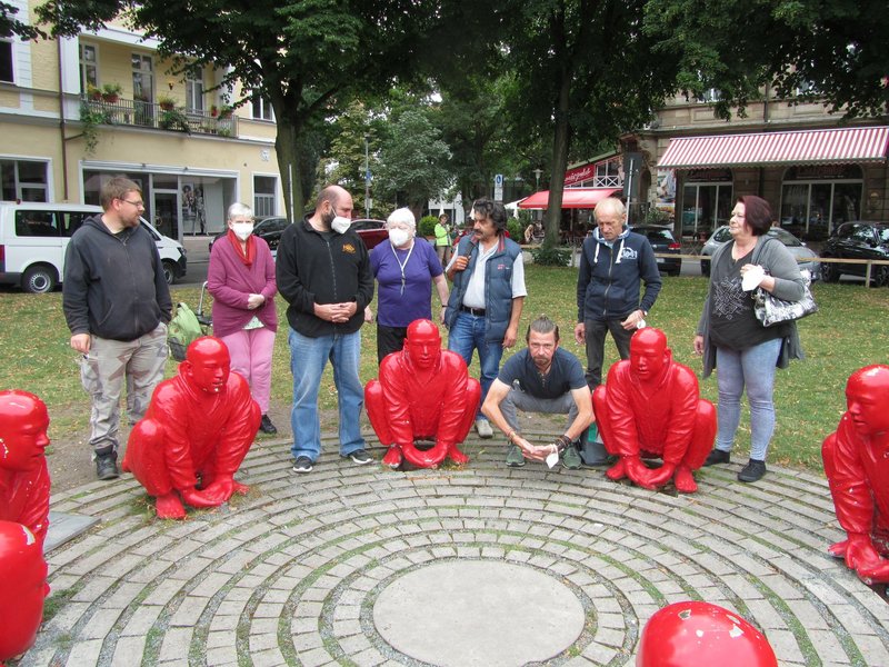 Frauen und Männer stehen um ein Kunstobjekt, dass einzelne rot lackierte Mönche in hockender Position zeigt. Ein Mann hockt sich zu den Mönchen und nimmt die gleiche Pose ein.