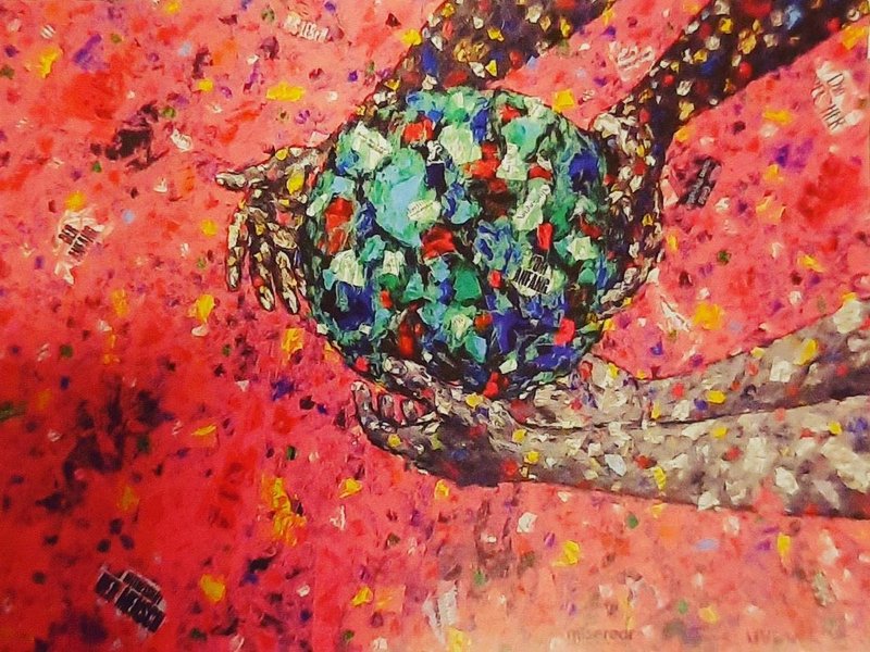 Der gestaltende Künstler hat das Hungertuch mit „Was ist uns heilig?“ tituliert. Aus Zeitungsschnipseln, Schlagzeilen, Kleber und Acrylfarben gestaltete er ein farbenprächtiges Kunstwerk.