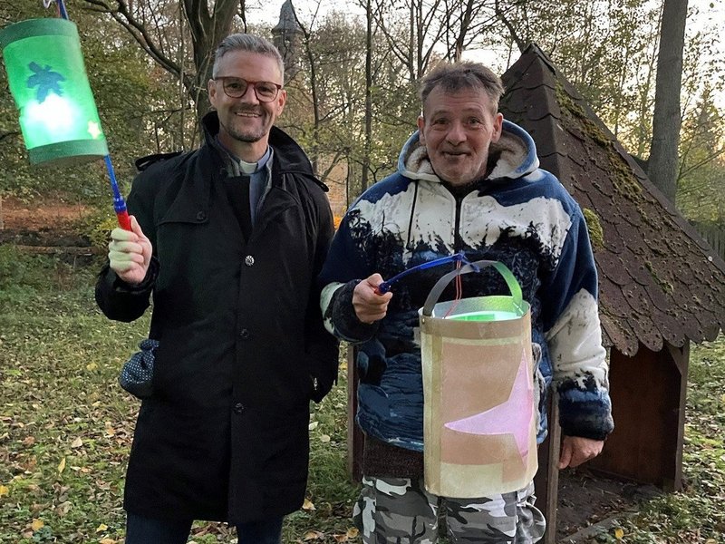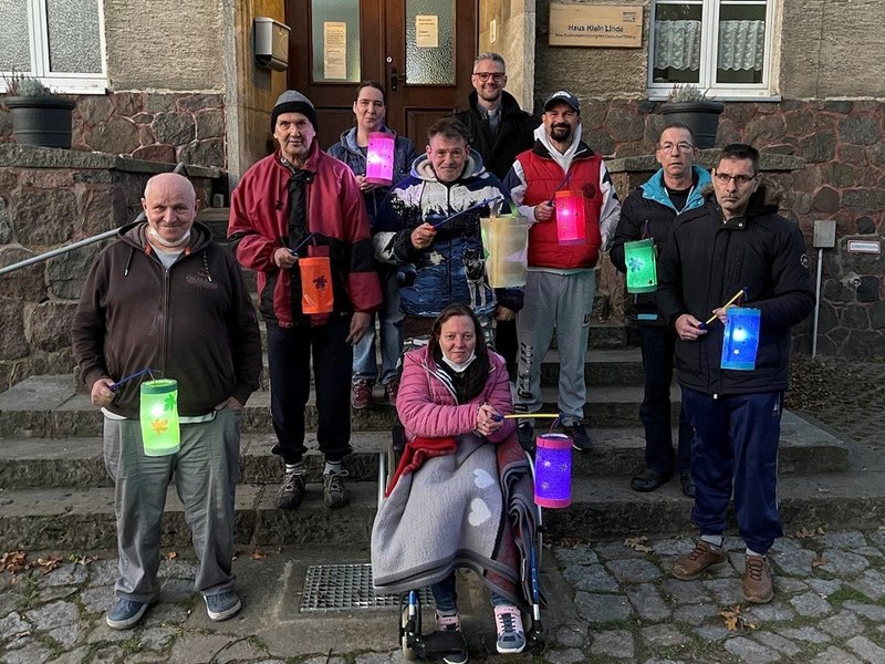Menschen nehmen sich überall mithin. Volker Kütter, Bewohner im Haus Klein Linde im nördlichen Brandenburg, kommt gebürtig aus Siersdorf bei Aachen. Aus seiner Kindheit und Jugend erinnert er sich gerne an die prächtigen St. Martinsumzüge im Rheinland. Da auch P. Jörg ein Freund vom Martinsbrauchtum ist, hatten beide die Idee, in der Arbeitstherapie im Haus Klein Linde Laternen zu basteln, und dann einen kleinen Umzug durchs Dorf zu machen. Vorher erzählte P. Jörg Geschichten aus dem Leben des Hl. Martin. Natürlich wurde auch traditionelles Gebäck den Bewohnerinnen und Bewohner, Mitarbeiterinnen und Mitarbeitern gereicht.