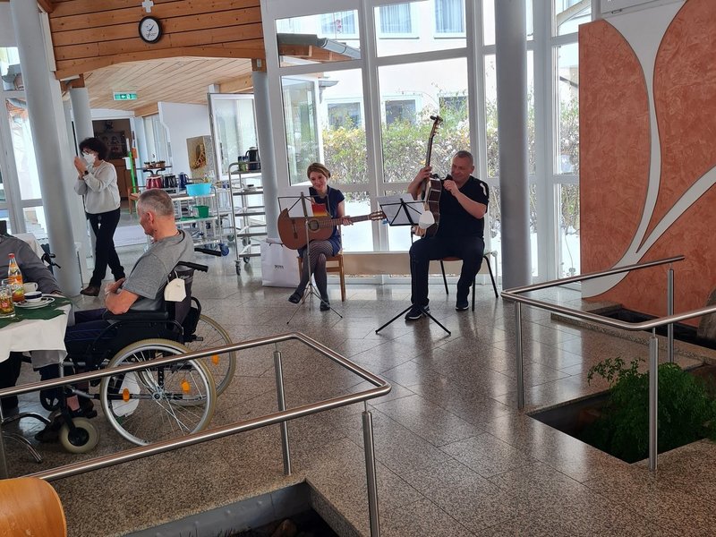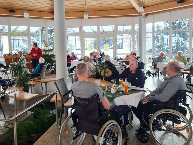 Im Pavillon wurde für die Seniorinnen und Senioren eine gemütliche Weihnachtsfeier veranstaltet. Gemeinsam sind Weihnachtslieder gesungen worden, begleitet am Klavier von Frau Sprügel, der ev. Gemeindefrauen. Gerontofachkraft Steffi und Ergotherapeut Harald haben mit ihrer Gitarre ebenfalls ein weihnachtliches Lied vorgetragen. Zu Mittag wurde gemeinsam lecker gespeist und die weihnachtliche Geschichte von Pfarrerin Dalferth durfte an so einem Tag natürlich auch nicht fehlen. Für die Bewohnerinnen und Bewohner wurden auf den Wohnbereich vor Heiligabend Geschenke verteilt, eine wunderbare Geste, über die sich alle gefreut haben.