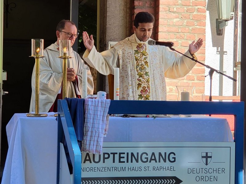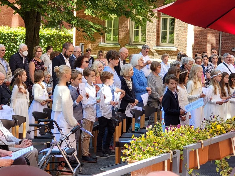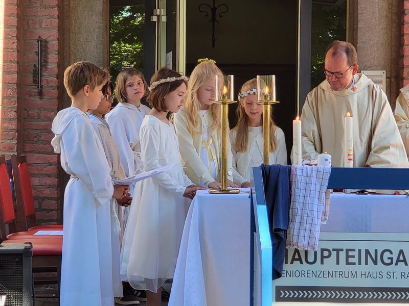 Gemeinsam mit der Pfarrei St. Andreas feierten Bewohnerinnen, Bewohner, Angehörige, Mitarbeitende und viele Gäste gemeinsam die Heilige Messe, bei der drei Kinder der Pfarrei ihre Erstkommunion erhielten. Anschließend startete die gemeinsame Prozession von unserem Seniorenzentrum aus.