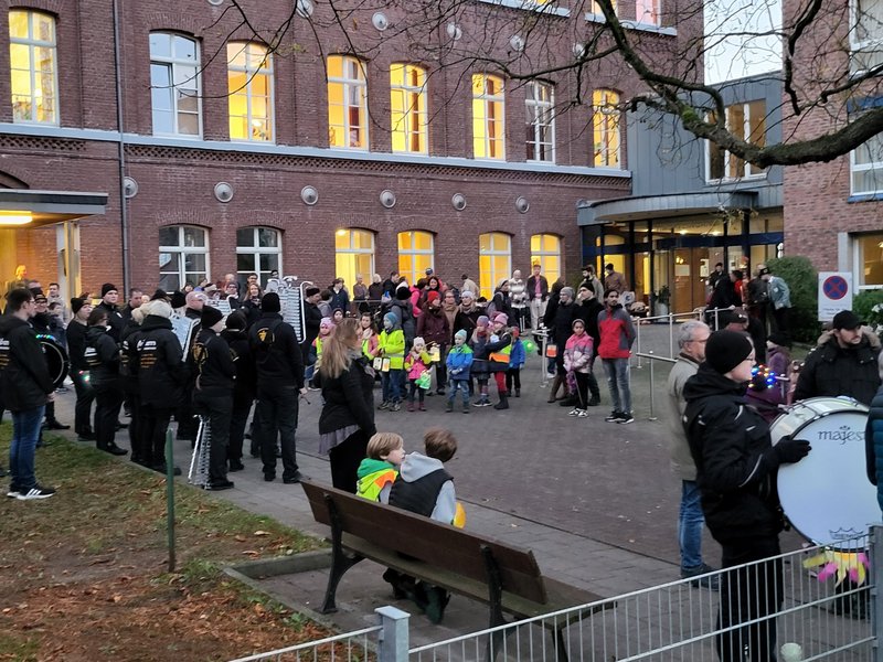 Ca. 400 Personen versammelten sich im Innenhof der Einrichtung und stimmten St. Martins-Lieder an. Viele Kinder mit ihren kreativ gebastelten Laternen brachten Bewohner/-innen und Angehörige zum Staunen. Startpunkt des großen St. Martinszuges in der Aachener Soers war wieder das Haus St. Raphael. Von hier aus ging man zum Schützenplatz, wo ein großes Martinsfeuer veranstaltet wurde.