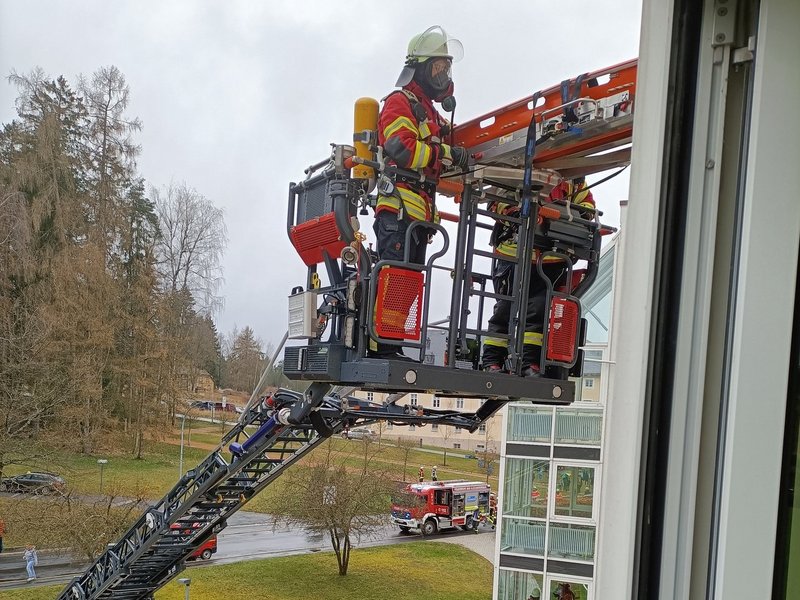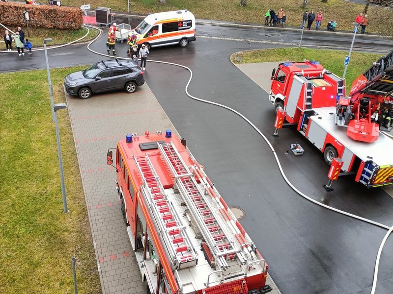 Es ist Samstag der 01. April 2023 um 09:30 Uhr, als die Nebelmaschine die BMZ auslöst die die aus dem Fenster wehenden Luftballons das Feuer symbolisieren.