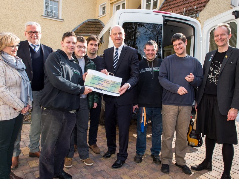 Michendorf, April 2018. Pünktlich zum Beginn der Konzert- und Festivalsaison 2018 übergab der Ministerpräsident von Brandenburg Dr. Dietmar Woidke heute Nachmittag im Beisein des Geschäftsführers der Ordenswerke, Dr. Thomas Franke, sowie der Leiterin der Behindertenhilfeeinrichtung Haus St. Norbert, Lorett Eichholz, den neuen Bandbus an die Michendorfer Inklusionsband „Jacke wie Hose“. Für den Erwerb des Bandbusses stellte der Ministerpräsident fast 14.000 Euro aus Lottomitteln bereit.