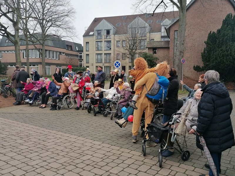 Der Rosenmontagsumzug fand am 20.02. nachmittags statt (der zog an unserem Haus vorbei) die Bewohner/-innen saßen in erster Reihe an der Friedenstraße um sich den Zug anzuschauen.