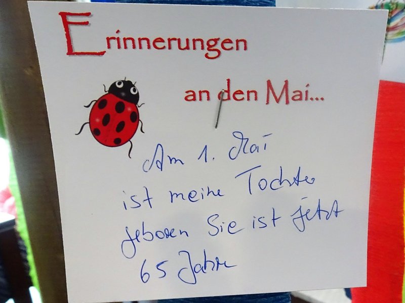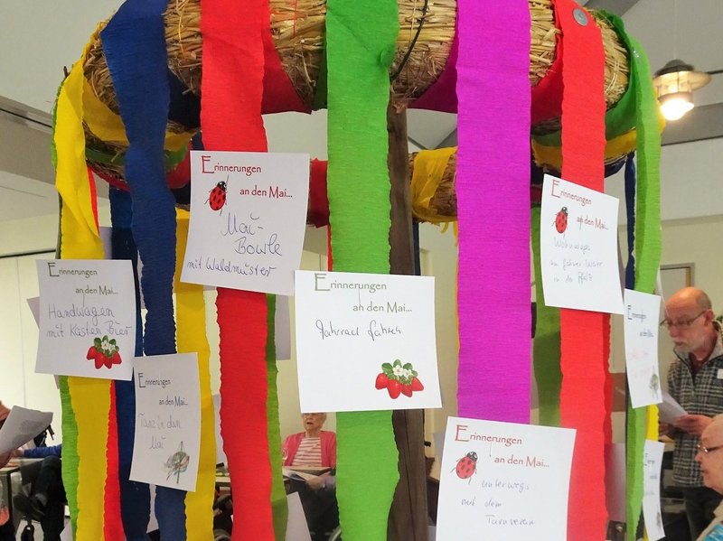 Begonnen wurde der Nachmittag mit Kaffe und Erdbeerkuchen. Im Anschluss erlebten wir mit Gesang und Vorträgen einen stimmungsvollen Nachmittag. Erinnerungen an den Mai in früheren Zeiten wurden ausgetauscht und fanden im Anschluss einen Platz an unserem Indoor- Maibaum.