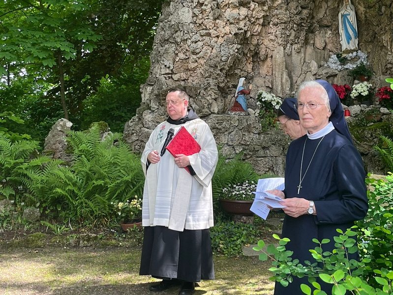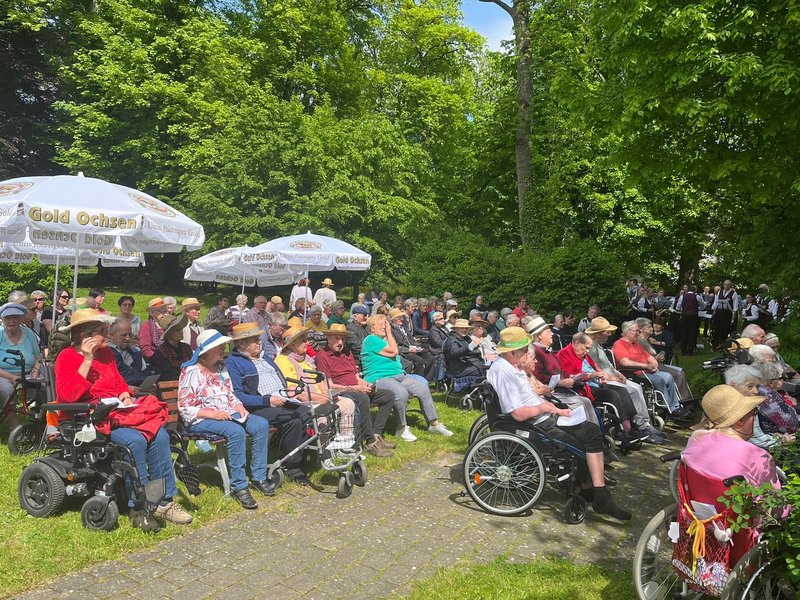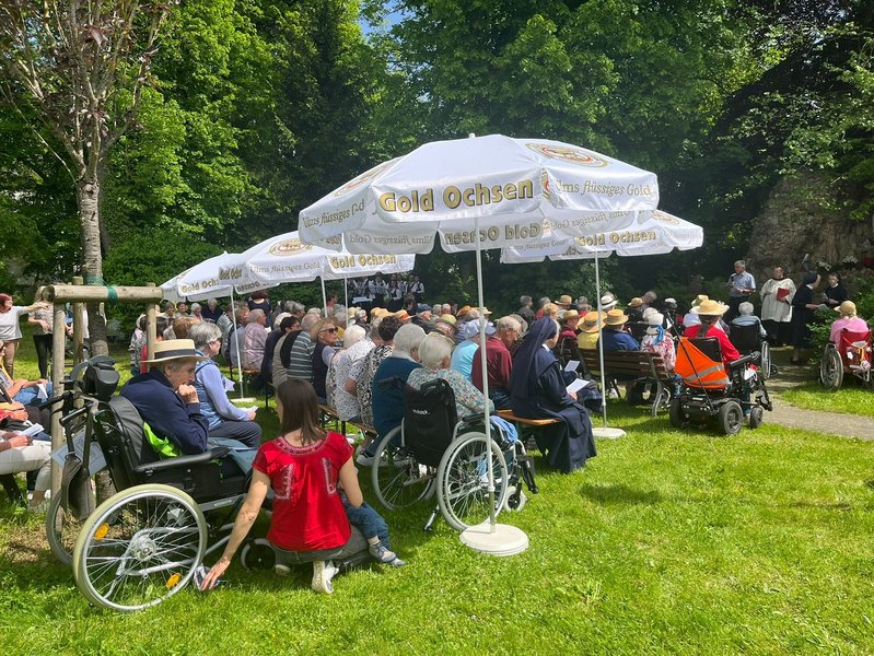 Die Steyler Missionsschwestern, die schon seit vielen Jahren im Haus St. Hildegard leben und wirken, feiern immer an einem Sonntag im Mai zu Ehren der hl. Jungfrau Maria eine kleine Andacht im Park des Hauses. Musikalisch begleitet wurde die Andacht vom Musikverein Oberdischingen. Die rund 150 Teilnehmenden, darunter fast die gesamte Bewohnerschaft des Haus St. Hildegard, Angehörige und Gäste aus dem Ort, freuten sich danach sehr über die Einladung des Bewohnerbeirates zu selbst gebackenem Kuchen. Kaffee gab es zwar auch, die kühleren Getränke erfreuten sich aber deutlich größerer Nachfrage. Mein Dank gilt allen Mitwirkenden, dem Bewohnerbeirat und meinem Team, das diese schöne Andacht seit vielen Jahren so liebevoll gestaltet.