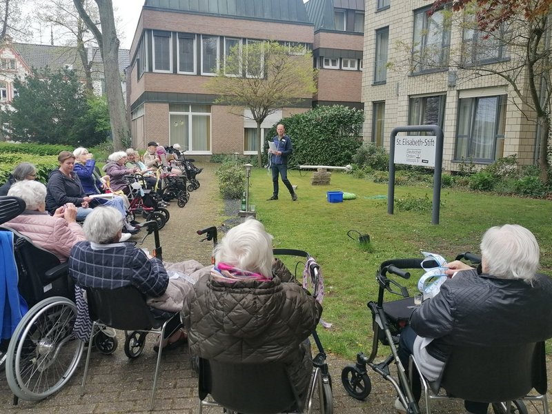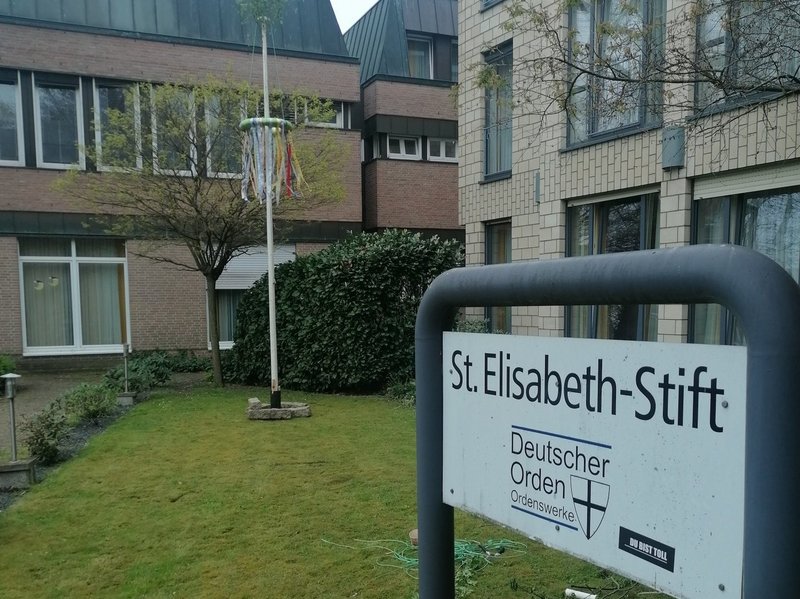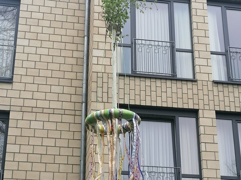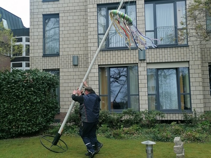 Am 28. April haben die Bewohner/-innen und Mitarbeiter/-innen des St. Elisabeth-Stifts den Maibaum vor dem Haus gemeinsam geschmückt und aufgestellt. Jeder hatte ein buntes Band, welches an dem großen Kranz befestigt war.