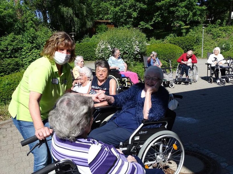 Bei herrlichem Wetter trafen sich unsere Bewohnerinnen und Bewohner zu einer gemütlichen Runde im Freien! Frau Braun, Mitarbeiterin im Betreuungsteam, erfreute unsere Bewohnerinnen, Bewohner sowie Mitarbeitende mit dem Klang ihrer Kalimba, einem Zupfinstrument. Es war ein sehr schöner Tag und die gute Laune lässt sich deutlich an den vielen strahlenden Gesichtern ablesen!