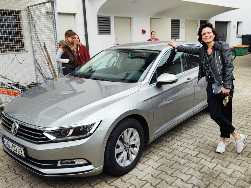 Dank Frau Heike Attenhauser - Mitarbeiterin in unserer Hauptgeschäftsstelle und zuständig für die Fuhrparkverwaltung/Versicherungen - können wir ein neues Dienstauto, einen VW Passat, unser eigen nennen. Frau Bettina Neumayr, Einrichtugsleitung, ist recht begeistert.