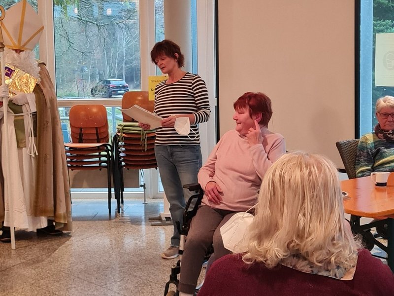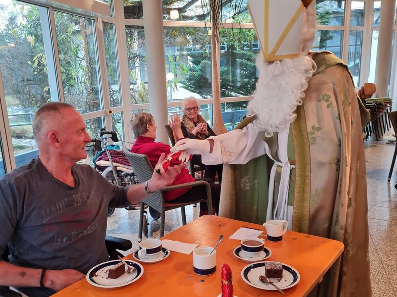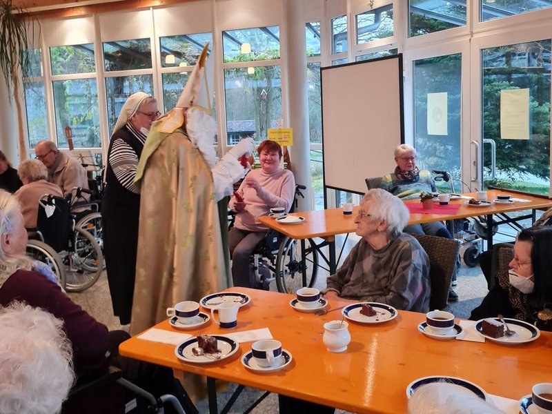 "Lieber heiliger Nikolaus, komm doch heut in unser Haus." Im Hause St. Michael in Bad Alexandersbad wurden die Seniorinnen und Senioren beim Kaffeenachmittag überrascht . Der Nikolaus besuchte unser Bewohner, hatte in seinen Sack für jede/-n einen kleinen Schokoladennikolaus dabei. Die Betreuungsassistentin Gudrun las eine Nikolausgeschichte vor. Es wurden Nikolauslieder, Adventslieder und weihnachtliche Lieder gesungen. Gerontofachkraft Steffi und Gudrun begleiteten die Bewohnerinnen und Bewohner auf der Gitarre. Zu unserer Kaffeerunde gesellten sich auch Angehörige dazu.