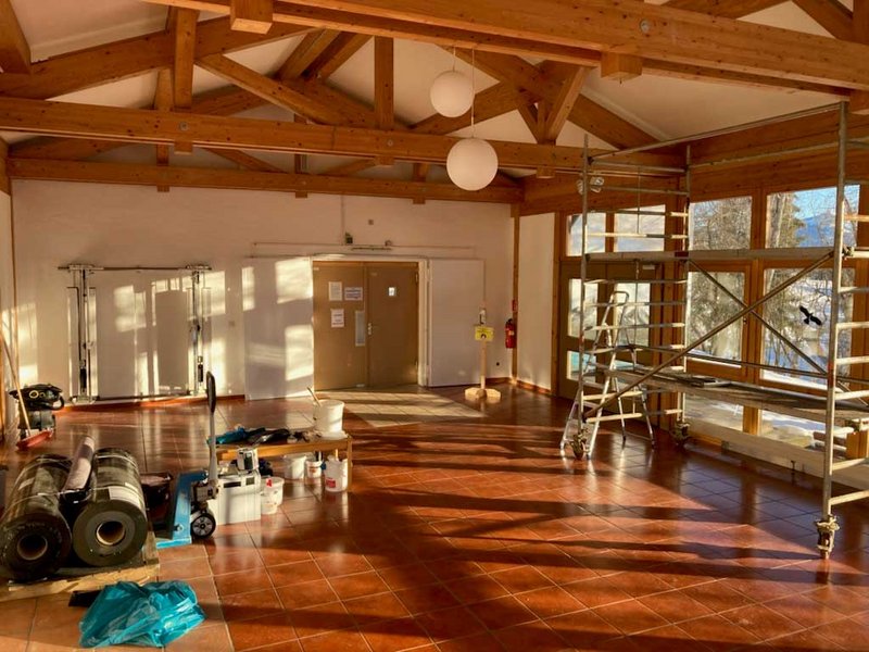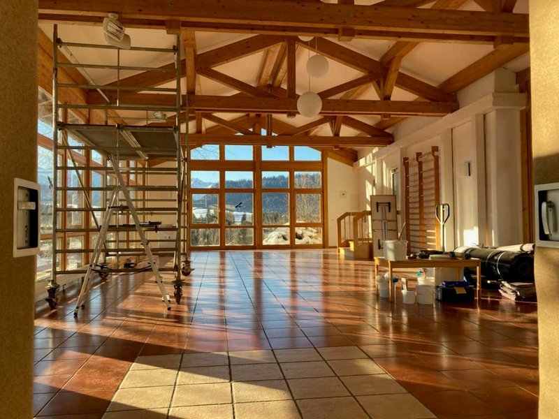 Bisher waren Medizinische Trainingstherapie und Kraftraum im Keller der Klinik, derzeit statten wir den Wintergarten des Klinik vor der Sporthalle aus, so dass ab Mai Patienten auf diesem Ergometer mit genau dem abgebildeten Panorama der Hörnergruppe, das Sie auf dem Foto sehen, Muskeln, Herz und Seele stärken werden.