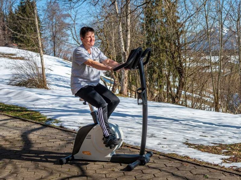 Wie Sie auf dem Foto sehen, haben wir es schon einmal aufgebaut und eine Mitarbeiterin daraufgesetzt, aber natürlich wird das Ergometer nicht draußen stehen, sondern bekommt einen besonderen Platz im derzeit in Neugestaltung begriffenen Sportbereich.