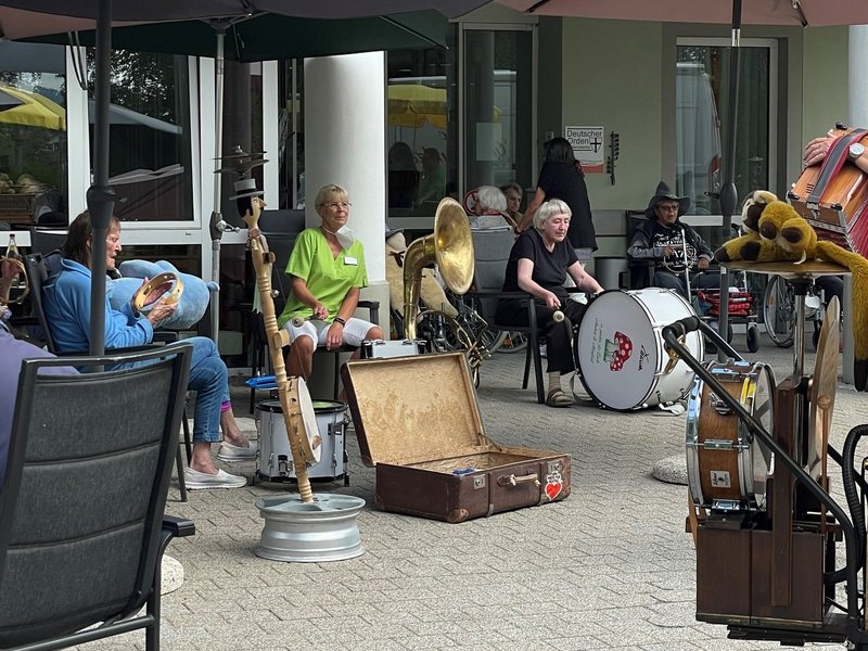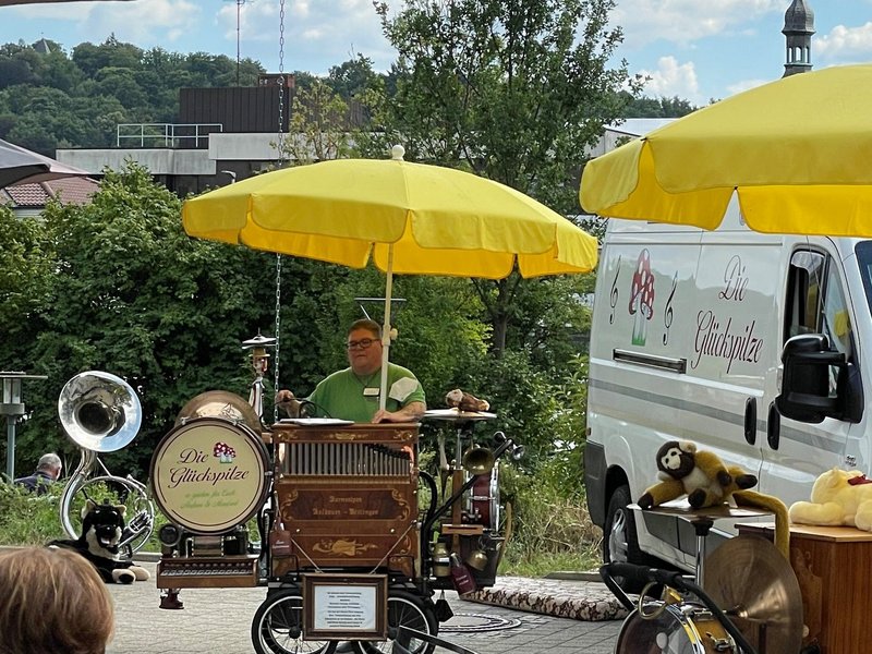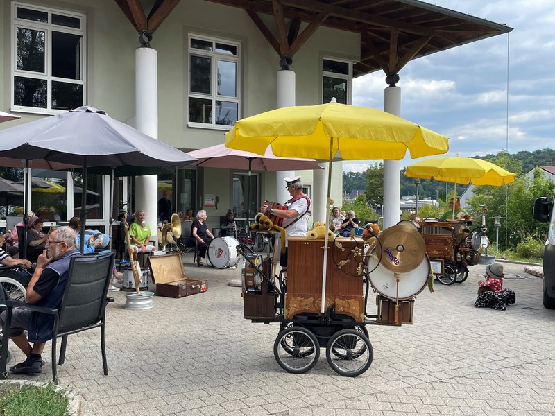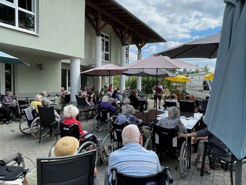 Richtig viel Freude hatten unsere Bewohnerinnen und Bewohner beim Auftritt vom Unterhaltungsmusiker „Glückspilz“. Er besuchte die Seniorinnen und Senioren mit verrückten Instrumenten, Drehorgeln sowie singenden und tanzenden Puppen. Ein musikalisches Highlight, an dem alle gerne teilnahmen!