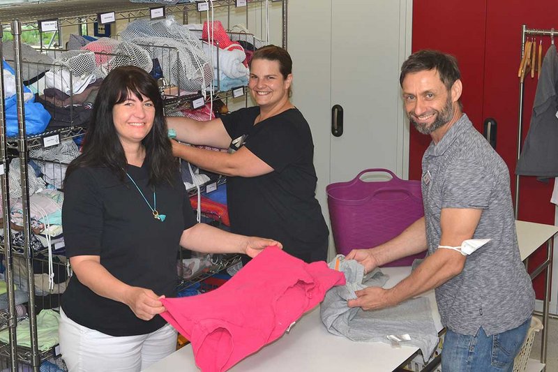 Zwei Frauen und ein Mann - lächeln wie frisch ertappt in die Kamera - während sie Kleidungsstücke zusammenlegen und ins Regal räumen