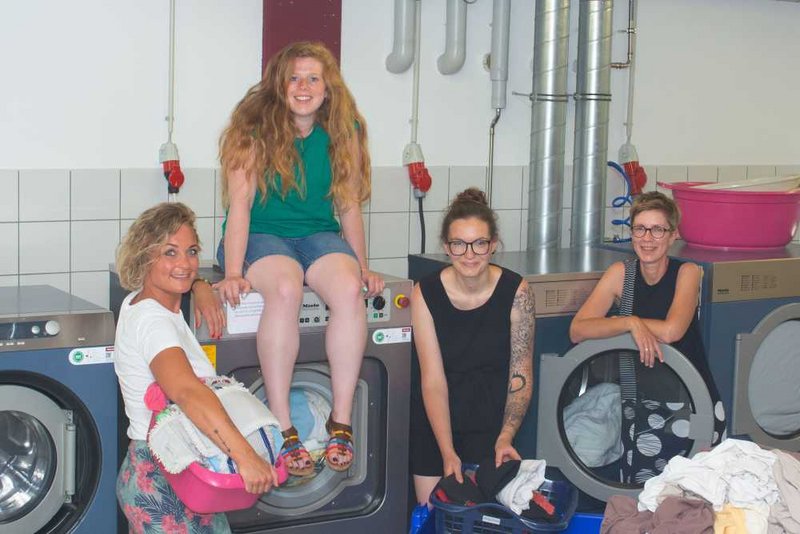 Vier junge Frauen befüllen die großen Waschmaschinen - eigentlich posen sie für die Kamera