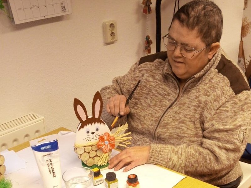 In unserer soziotherapeutischen Einrichtung Haus am See in Tornow starten die Vorbereitungen für Ostern. Unsere Bewohnerin, Frau Hein, fertigt liebevoll die letzten Arbeiten an einem Osterhasen.